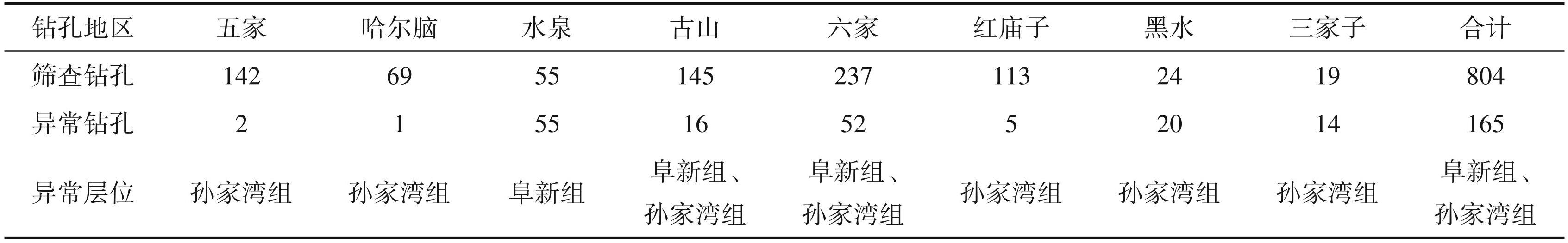 砂岩铀矿术往往以隐伏矿形式埋藏于地下,很难被发现。以往借助钻孔测井放射性的曲线异常是寻找此类矿产最直接有效的找矿方法。自 20 世纪60年代起,煤炭和核工业部门在平庄盆地周边开展了煤炭及放射性地质勘查,在钻孔测井工作中先后发现了一批放射性异常孔,形成了大量宝贵的原始资料,内容详实、质量可靠(郑翠等,2020)。本文对前人钻孔资料进行异常筛查,重点关注测井时异常钻孔(图2)。首先统计钻孔岩性及层位,绘制钻孔综合柱状图、钻孔剖面图;其次统计地层、砂体、泥岩厚度,绘制铀储层砂体等值线图;最后统计钻孔中异常厚度及层位,绘制铀异常分布规律图等图件。对研究区铀异常分布特征及砂岩型铀矿成矿地质条件进行研究。共分析钻孔804个(表1),其中五家地区142个、哈尔脑地区69个、水泉地区55个、古山地区 145 个、六家地区 237 个、红庙子地区 113 个、黑水地区 24 个及三家子地区 19 个。共发现异常钻孔165个,其中五家地区2个、哈尔脑地区1个、水泉地区 55 个、古山地区 16 个、六家地区 52 个、红庙子地区 5 个、黑水地区 20 个及三家子地区 14 个,异常发育层位为白垩系阜新组和孙家湾组(图3)。