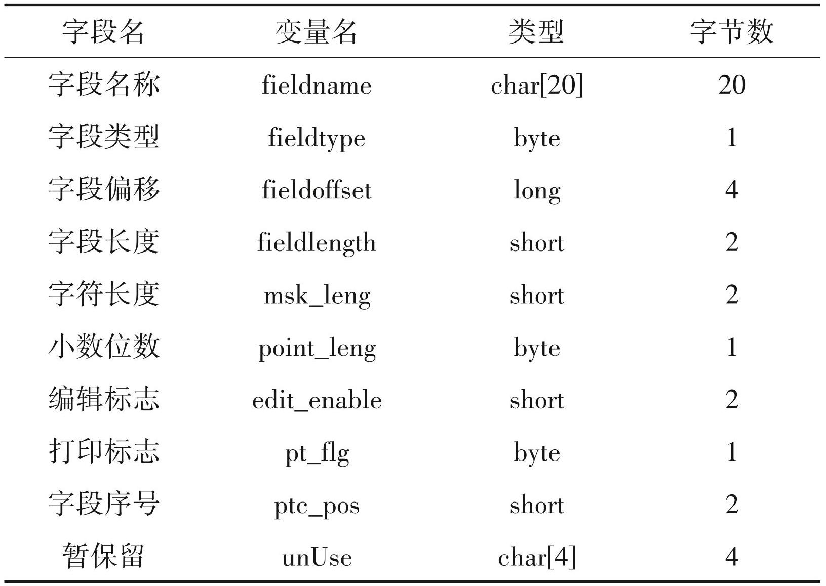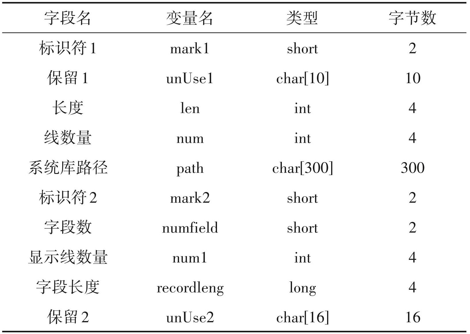 高程数据通常以属性数据的形式进行保存,而属性数据由属性头、字段头和字段内容3部分组成。属性头记录了字段的个数、内存长度、线数量等数据,占用内存 348 字节,数据结构如表4。字段头主要用于定义字段的属性,包括字段名,字段类型,字段长度,字段字符的长度、小数位数、编辑状态等,数据结构如表5,占用内存 39 字节。字段内容主要存储属性值,数据结构如表6。