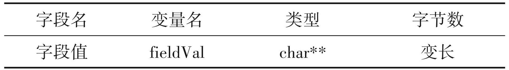 字段的属性值则存放在fieldVal中,其数据类型为二维指针字符型,其大小为num×每个字段的长度 (表6)。根据前面的分析,线的字段内容长为 69字节,即recordleng记录的数据。其数据块紧随字段头后,见图7(包含了两条线的字段内容,共138字节)。