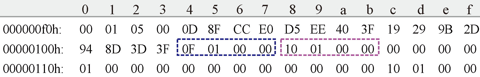 线条数数据存放在头文件 00000100h 行的第 4 至11位置;其中4-7位置为实际线条数(图3蓝色框线,0F 01 00 00),读取方法为 fread(&numLine,4,1, pFile)(numLine 为 4 字节整型,pFile 为文件指针),则 numLine=271,即线条数为 271 条。第 8-11 位置 (图3粉色框线,10 01 00 00)为线显示条数,读取方法 fread(&nLine_show,4,1,pFile)(nLine_show 为 4 字节整型),则 nLine_show=272,即显示线条数为 272,比实际线条数多1。