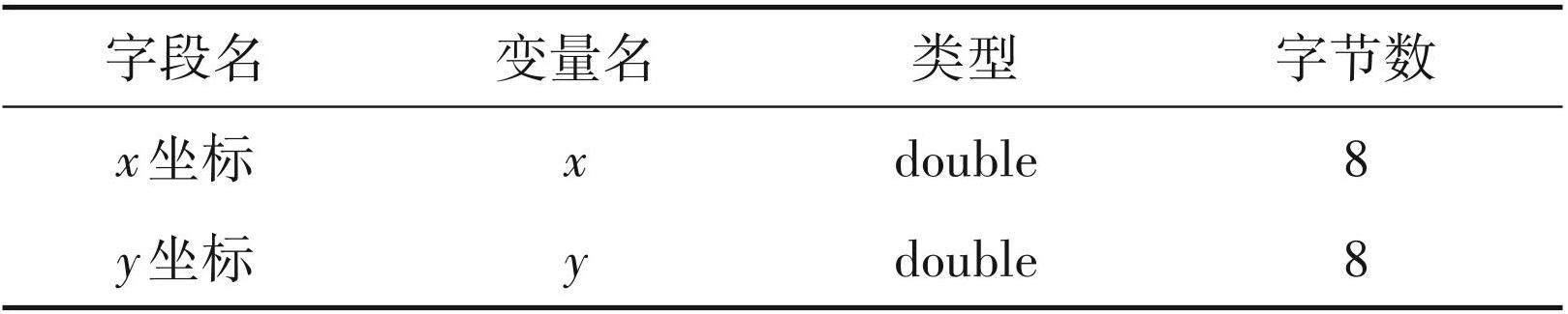 线图元数据起始位置记录在 position[0]中,其值为817,即00000330h行的第2位置(图4);长度为 len[0],len[0]值也等于 57×nLine_show。该数据块中每条线图元由57字节组成,其描述了线的显示参数、节点数及线节点坐标的位置等,数据结构如表2 和表3。采用表2的数据结构一一读取数据,即可知线节点数 nNod 的值。线节点坐标读取位置等于 position[0]+offset,运用 fseek(pFile,position[0] +offset, SEEK_SET)(pFile为文件指针)找到线节点坐标位置,后按 for(int i = 0; i <nNod; i++){fread (&coor[i]. x,8,1, pFile); fread(&coor[i]. y,8, 1, pFile);}的方式读取节点坐标。按照此方法即可完成线节点坐标的读入。