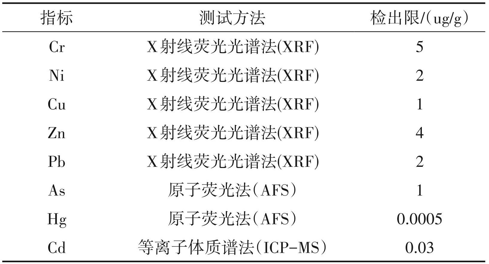 土壤重金属控制指标主要参照建设部《绿化种植土壤标准》(CJ/T340-2016),对 Cr(总铬)、Ni、Cu、 Zn、Pb、As、Hg、Cd 进行测试,测试单位为天津市地质矿产测试中心,测试方法及检出限如表1所示,样品测试中标准样,准确度和精密度控制在标准要求范围内,各项技术指标的分析合格率均为 100%,样品质量能够满足要求。