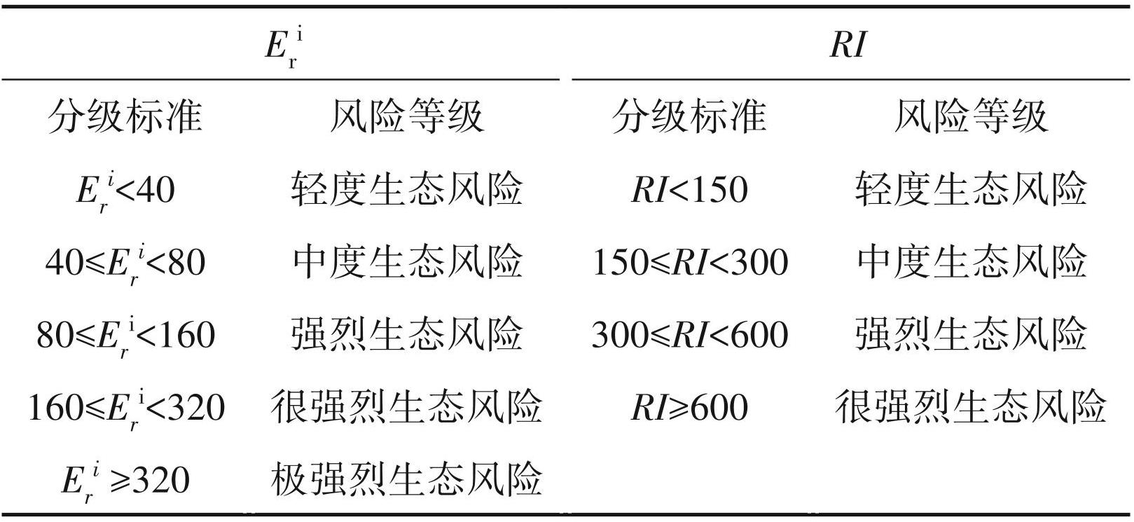 土壤重金属污染是土地调查中重点关注的问题,土壤重金属具有容易积累、隐蔽性高、毒害性强、污染难以恢复等特点,又因城市绿地与人类活动密切相关,自然得到人们的重视(Szolnoki et al., 2018;Islam et al.,2018;江山等,2019;张杰等, 2019),本文采用Hankanson提出的潜在生态风险指数法(韩平等,2015;张倩等,2015;李春芳等,2018; 陈为峰等,2019;代静等,2020;任晓辉等,2020;姚万程等,2021)对环城四区绿地进行生态风险评价,具体算法如下所示: