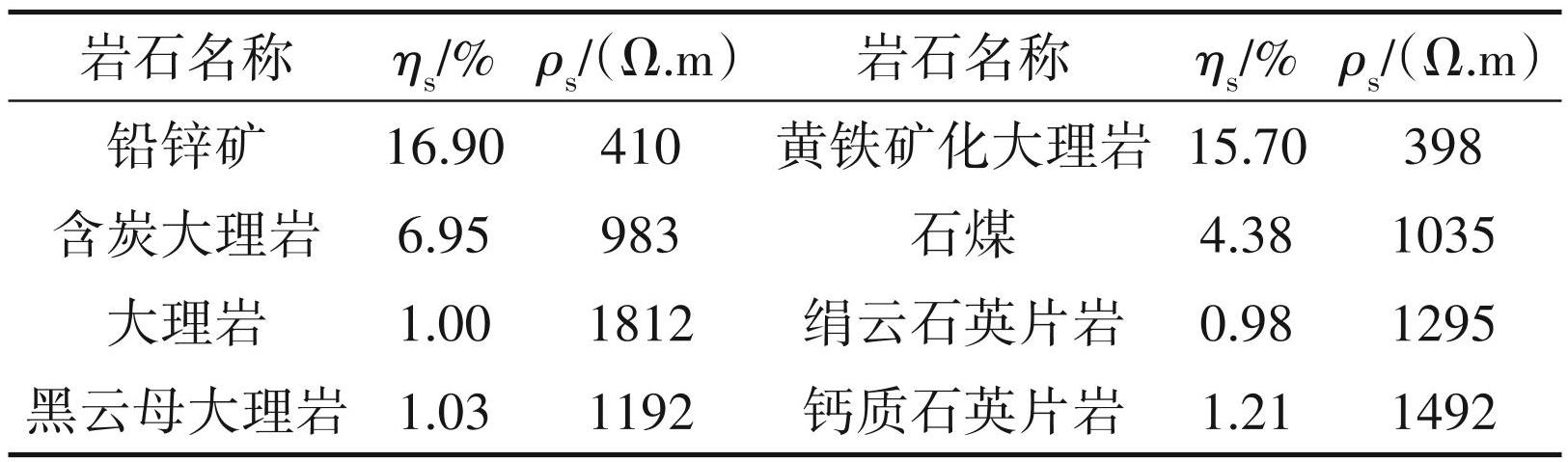 从区内岩石的电性参数表可以看到区内岩石电性差异较明显(表5)。铅锌矿化、黄铁矿化大理岩、含炭大理岩和石煤的极化率极高。结合平面取得的极化率异常看,含炭大理岩和石煤具有幅值较低变化大,呈面状分布的特点,而含矿构造带的极化率异常幅值较高,多呈线性分布特征,两者有明显的区别。围岩大理岩、绢云石英片岩、黑云大理岩、钙质石英片岩的极化率较低,都在 1% 左右;而它们的电阻率一般为1100~1800 Ω·m。从物性结果来看,含矿体与围岩有较明显的电性差异,具有高极化率低电阻率特性,是本次开展激电中梯工作的物性前提。