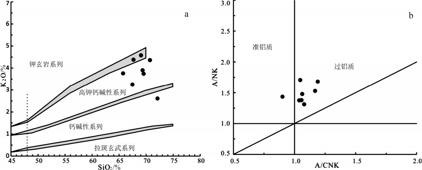 图4 卧龙岗二长花岗斑岩SiO2-K2O图解(a)和A/CNK-A/NK图解(b底图据Pearce,1996)