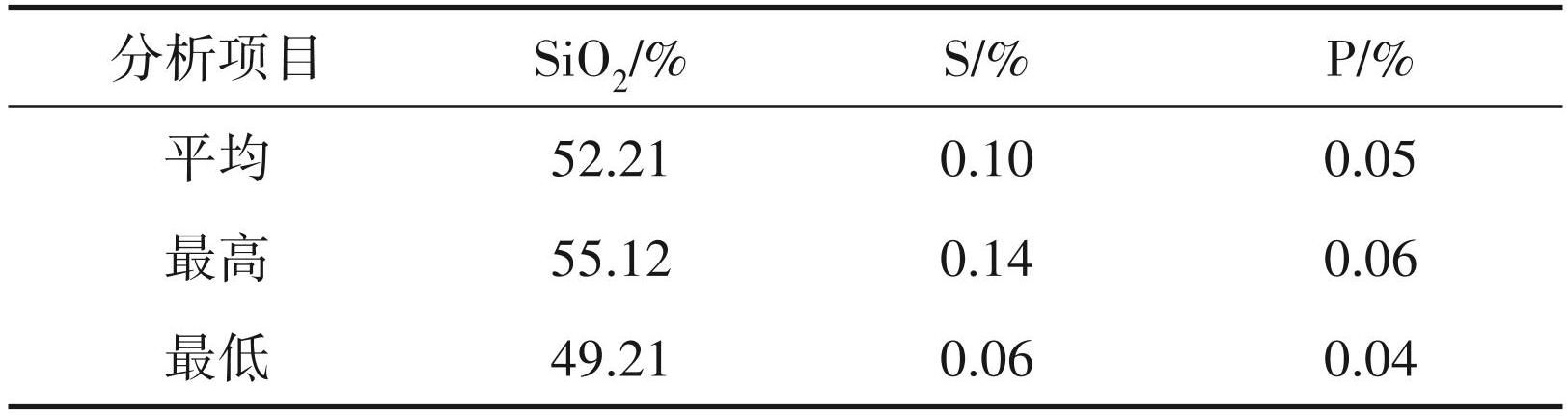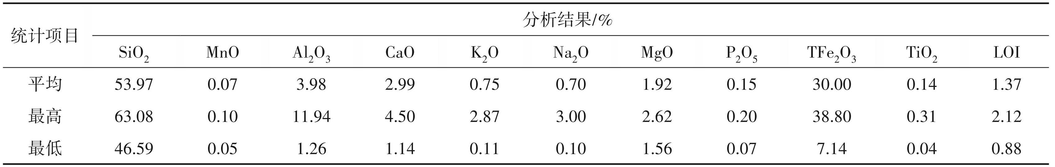 根据研究区内 630 件矿石基本分析样品统计,各矿体 TFe、mFe 品位变化系数分别为 1. 06%~31.22%、1. 06%~39.30%,其中Ⅴ、Ⅷ、Ⅸ号3个主矿体的 TFe、mFe 品位变化系数分别为 2.23%~11.37%、1. 06%~11.30%,品位变化系数均<50%,表明各矿体矿化连续,品位变化均匀。研究区内 8 件矿石光谱分析样品统计表显示(表2),矿石其他伴生有益组分含量均未达到伴生矿产工业指标要求。研究区内 14 件样品组合分析结果统计表显示 (表3),矿石中伴生的有害组分主要是 SiO2,其平均含量为52.21%。矿石中S、P有害组分的平均含量分别为 0.10%、0. 05%,均低于有害组分最低含量要求。