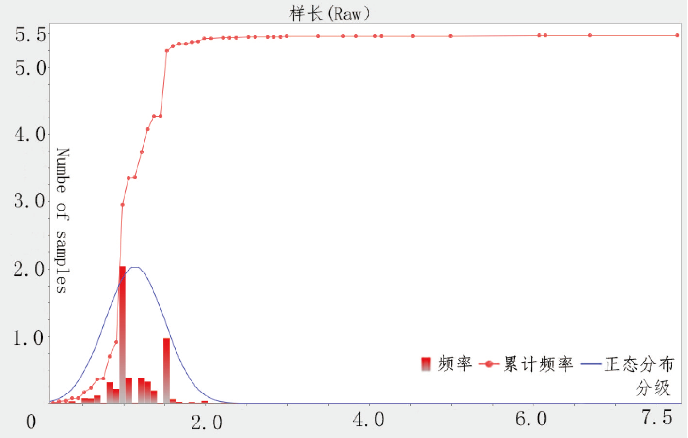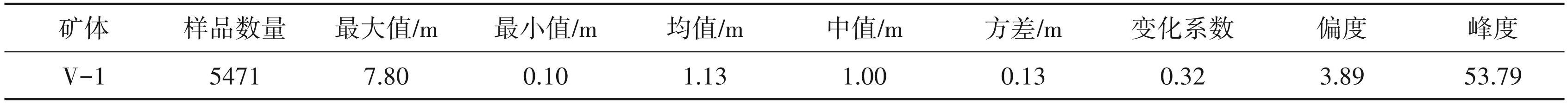 利用Surpac软件进行V-1矿体内任意空间位置处Au元素品位的估算,以圈定范围并进行资源储量估算。根据区域化变量理论,较小的区域具有更相似的数据分布,使得样品的品位分布趋近于正态分布。根据地质统计学原理,为了确保参数估计的无偏性,同类参数的地质样品段应具有一致的长度。通过数据库的数据提取功能,提取样品表中的数据并获取采样长度,以提供组合样样长分析和确定参数的依据。利用“基础统计”功能进行样长分析(王中民,2010;阮诗昆,2017;贾慧敏等,2020)。符合要求样品为 5471 件,结果显示样长均值为 1.13 m、变化系数为31.87%,偏度3.89,峰度54. 03,确定最佳的样品组合长度为 1. 00 m。通过提取钻孔与矿体相交的线段,生成相交线文件,并进行样品筛选。按照每 1 m 一个样本的方式重新组合样品,并提取这些样品数据以进行矿体品位的插值分析。矿体组合样变异函数、正态分布及直方图如图7、表1 所示。