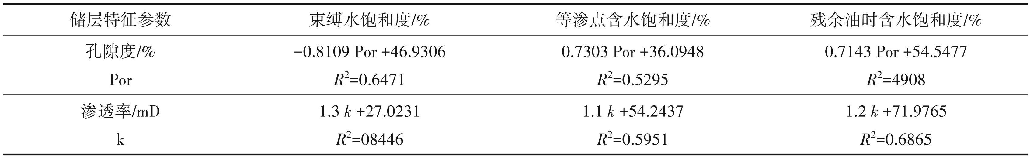 通常情况下,储层的物性(孔隙度、渗透率)越好其渗流能力越强。相关性分析表明:(1)束缚水饱和度与物性具有明显的负相关关系(图10,表4),相关性较好,随着渗透率的增大,渗流能力逐渐变强,束缚水的含量降低,导致束缚水饱和度减小。 (2)等渗点含水饱和度、残余油处含水饱和度与储层物性均呈现为良好的正相关关系(图10,表4),说明随着水驱的不断进行,储层中孔隙相互之间逐渐连通,渗流面积不断增大,储存空间增加,随着孔隙度的增加,含水饱和度逐渐增大;(3)等渗点含水饱和度、残余油处含水饱和度与渗透率的相关性较孔隙度强,表明储层的喉道不仅使孔隙之间相互连通,提高流通的能力,而且能够提供新的渗流通道、储集空间,可知喉道在水驱的后期对渗流能力的影响较强。