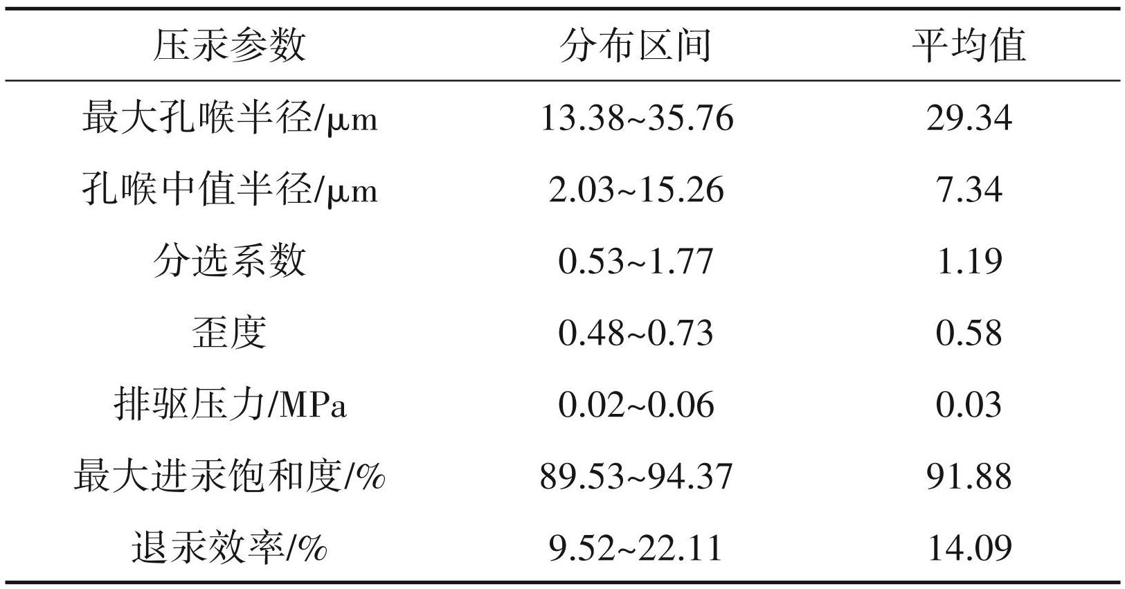 根据孔喉大小进行分析,最大孔喉半径介于 13.38~35.76 μm,平均为 29.34 μm,孔喉中值孔径介于 2. 03~15.26 μm,平均为 7.34 μm,中值半径可以反映孔喉大小及分布趋势,可以从整体上反映储层的孔隙结构;根据孔喉分选性进行分析,分选系数介于 0.53~1.77,平均为 1.19,喉道歪度介于 0.48~0.73,平均为 0.58,整体偏细歪度,样品喉道歪度之间的差别也较小;根据孔喉连通性进行分析,研究区储层砂岩排驱压力为0. 02~0. 06 MPa,平均为 0. 03 MPa,具有相对较低的排驱压力,最大进汞饱和度介于89.53%~94.37%,平均为91.88%,最大进汞饱和度较高,退汞效率为9.52%~22.11%,平均为14. 09%,具有较低的退汞效率(表2)。