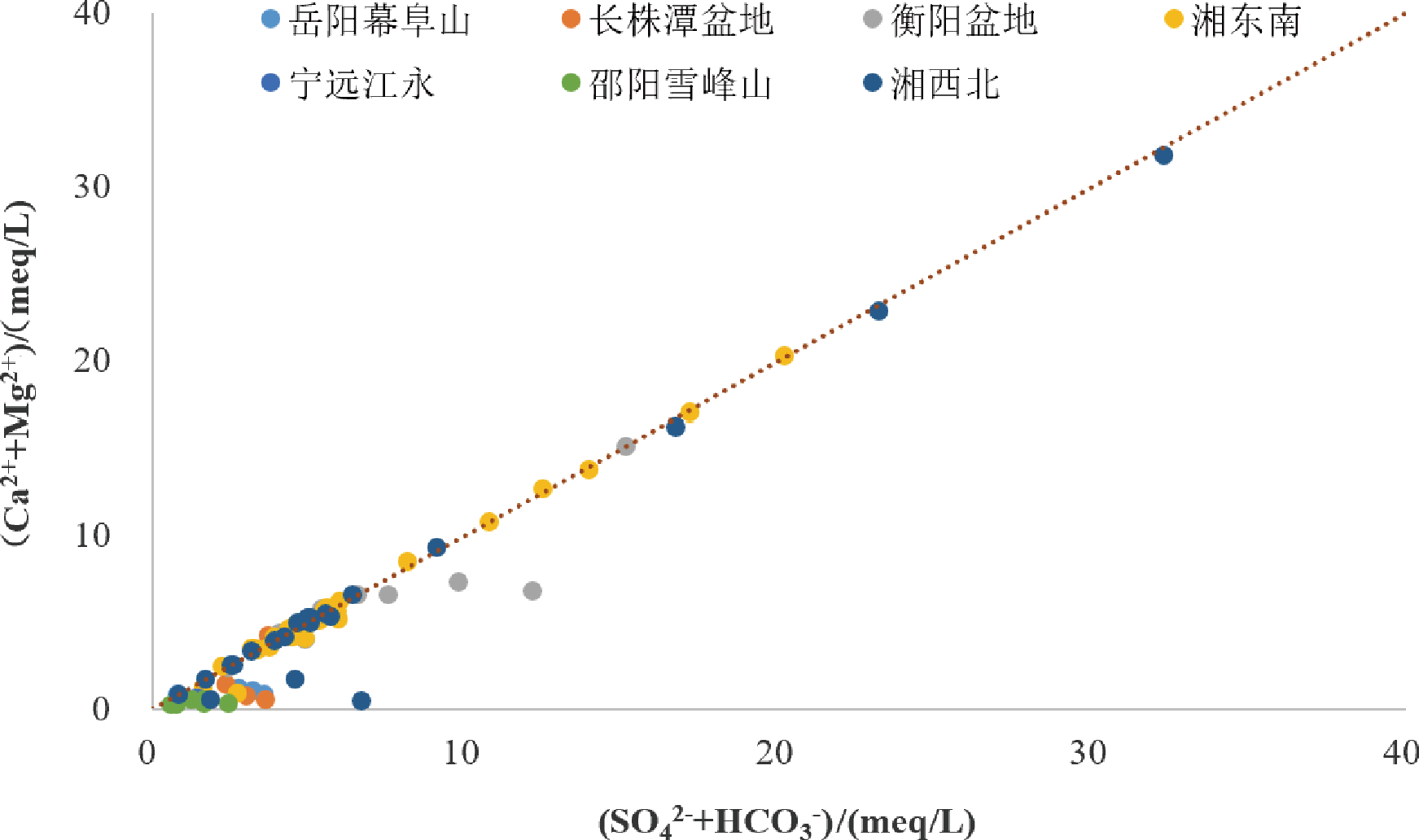 图6 (Ca2+ +Mg2+)-(SO4 2- +HCO3-)关系