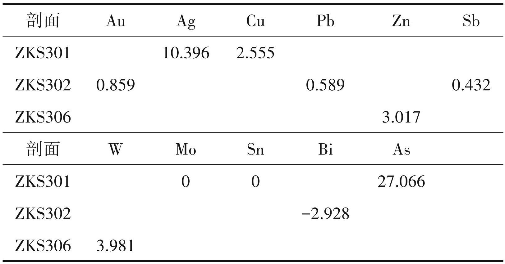 由表4 可知,在由浅至深的钻孔上出现了 2 个以上元素分带指数极大值,钻孔 ZKS301 剖面上出现了 Ag、Cu、Mo、Sn、As元素的极大值,ZKS301剖面上则是Au、Pb、Sb、Bi,Zn、W则是在ZKS306剖面上。因此,依据表4 中的分带指数初步得出矿体分带序列为:(Ag、Cu、Mo、Sn、As)→(Au、Pb、Sb、Bi)→ (Zn、W)。