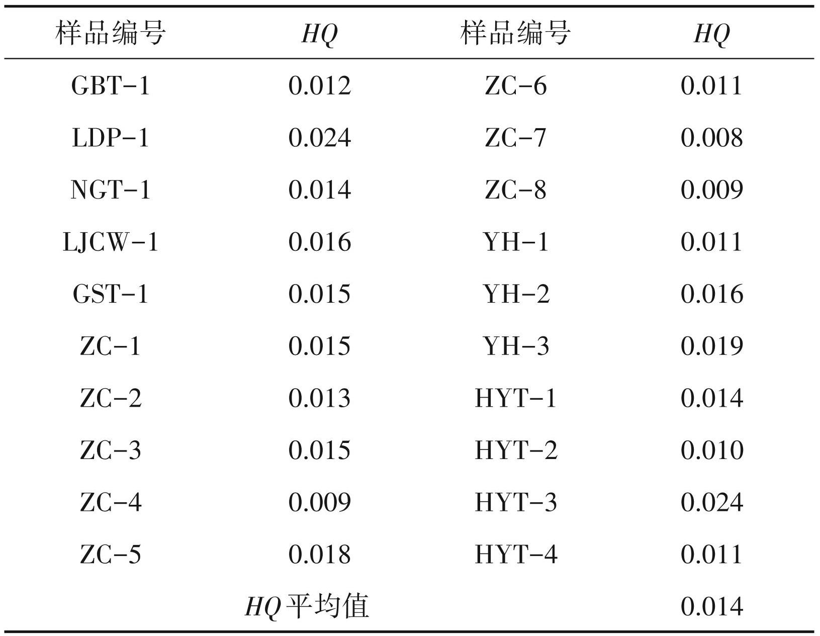 研究区土壤 V元素危险商法计算结果见表12,其HQ为0. 008~0. 024(平均0. 014),表明研究区周围居民 ADDoral远低于 RfD,对身体产生 V 健康风险可能性极低,这与地累积指数和富集因子法评价的结果一致。