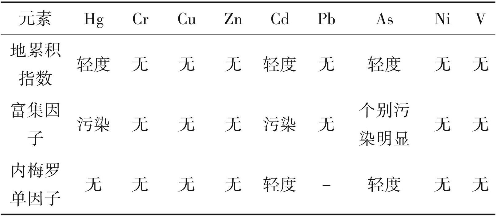 土壤中重金属元素污染结果见表13,虽然各种评价结果显示各元素的污染程度有所差异,本研究综合分析地累积指数、富集因子和内梅罗单因子等方法,认为Hg、Cd和As这3种元素均有不同程度的污染,其余元素无明显污染特征。