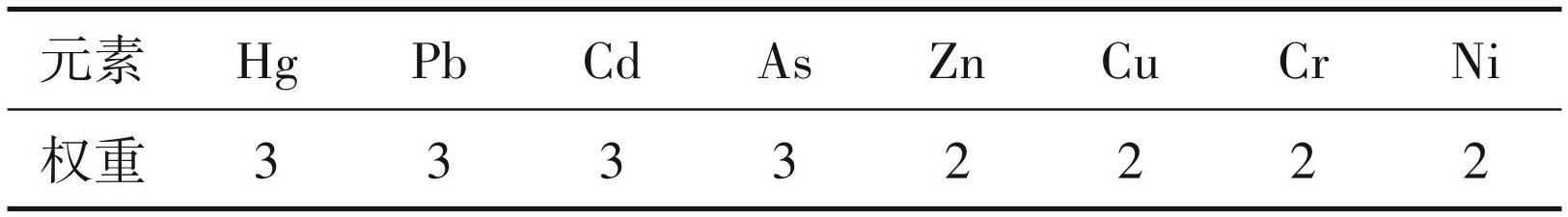 式中(4、5):P 综为样品点的综合污染指数;Pimax 为i样品点重金属元素中单项污染指数的最大值;为内梅罗单因子指数的平均值;w 是重金属对环境的影响权重(张云霞等,2018)(表3)。P综 ≤ 0.7, 0.7 <P综 ≤ 1. 0,1. 0 <P综 ≤ 2. 0,2. 0 <P综 ≤ 3. 0 和P综 >3. 0分别指示安全,警戒线,轻污染,中污染和重污染污染程度等级(贺灵等,2021)。