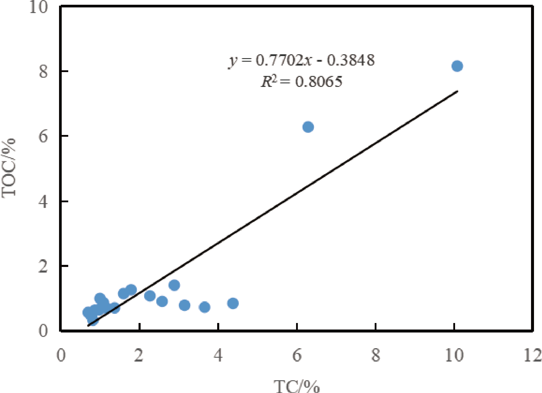 TC与TOC的差即是样品中无机碳(TIC)的相对含量。计算结果表明,土壤样品中的无机碳含量较低,为 0. 01%~3.54%,两件矿渣样品的 TIC 含量也较低,分别为 0. 01% 和 1.92%。相关性分析结果表明土壤和矿渣中 TOC 和 TC 呈明显的正相关(R2 = 0.8065)(图2),表明土壤和矿渣样品中碳的主要赋存形式为有机碳。