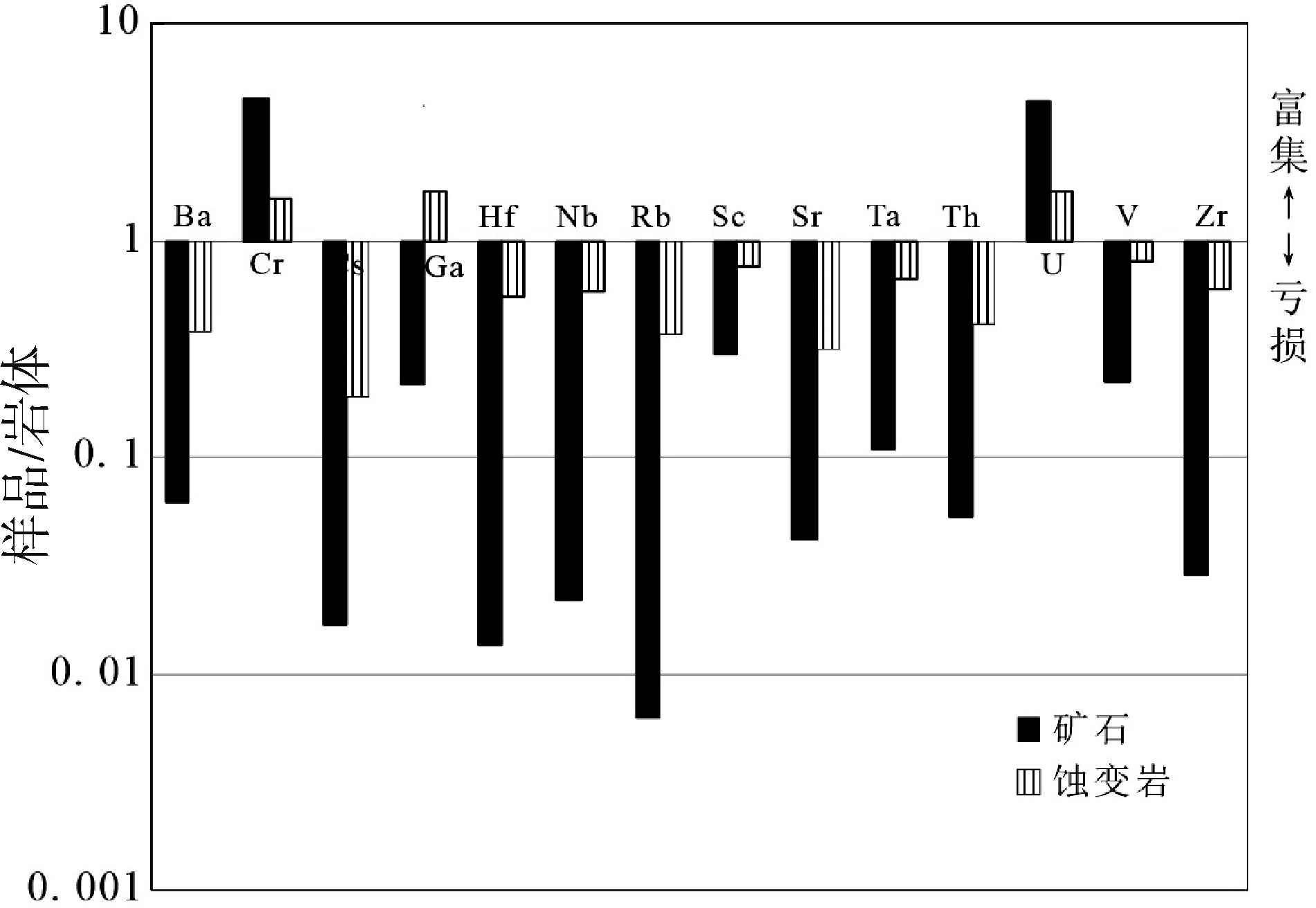 与中国东部陆壳相比(图5),矿石中富集元素为:Te、Sb、Co、Ti、Cd、Se、Sn、Sb、V、As、Mo、Ag、W、 Zn、Cu、Au、Bi。蚀变岩中富集的元素为:Cs、Nb、Be、 Ba、Rb、Ta、Th、Ga、Co、Ti、F、As、V、Pb、Se、Zn、Cd、 Mo、Cu、W、Ag、Sn、Bi、Au。矿石中亏损的元素为:F、 Be、Cr、Ta、Ga、Ba、Th、S、B、Cs、V、Li、Hg、Se、Nb、Zr、 Rb、Hf。蚀变岩亏损元素为:Hf、Zr、Te、Li、V、Co、B、 Cr、Sr、Se、S、Hg。