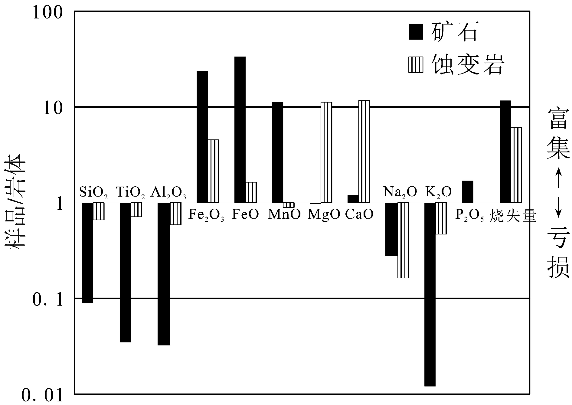 图3 银家沟硫铁矿石和蚀变岩相对于岩体主要元素亏损-富集图