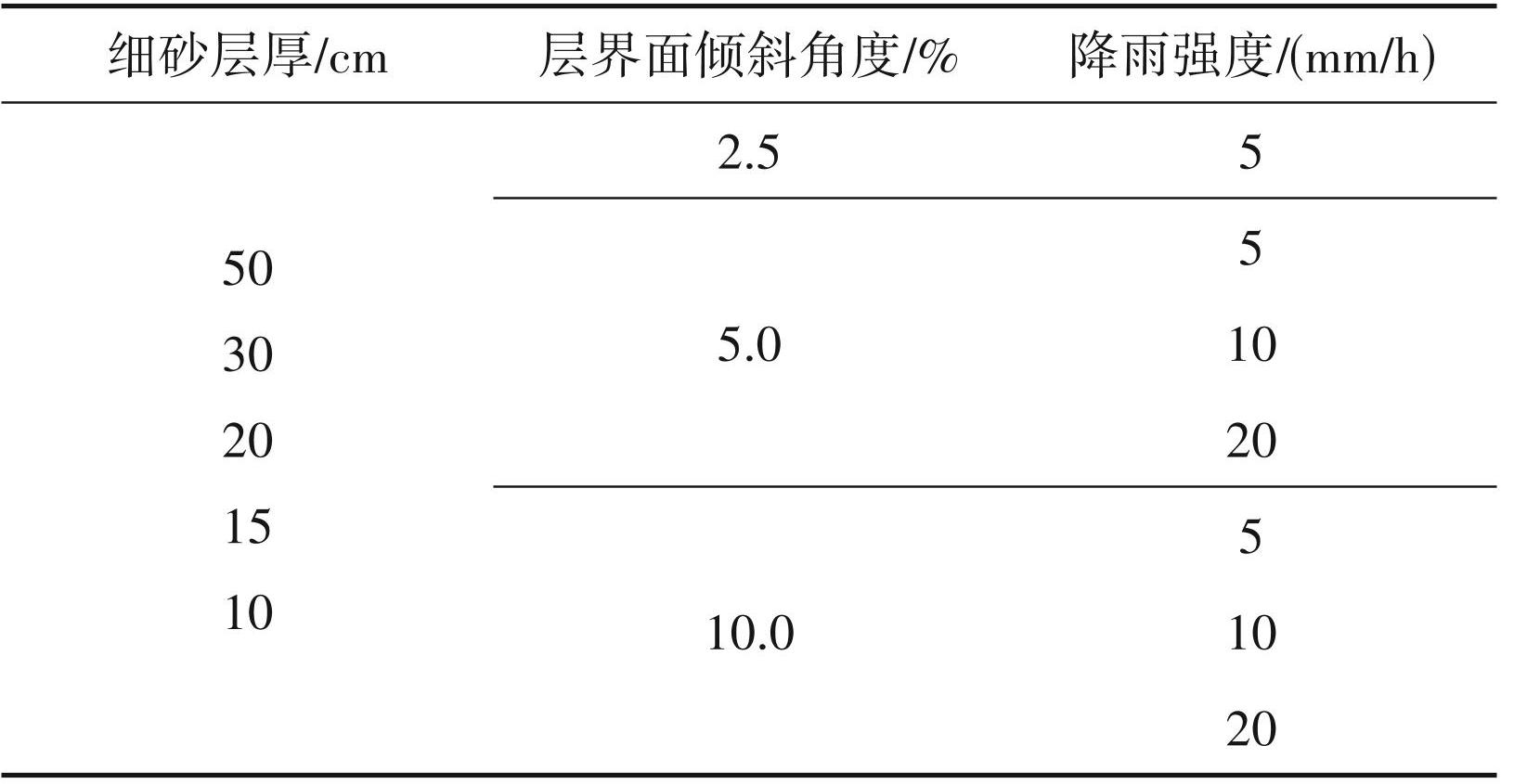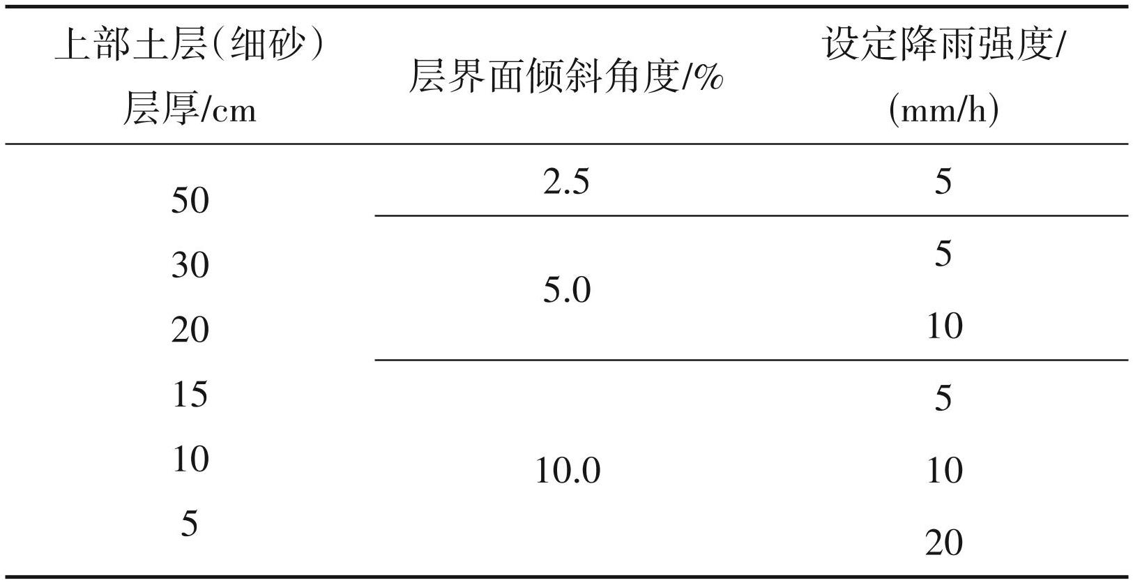 此次试验总共设置了31种条件,其中上层土层 (细砂)的厚度为 10~50 cm,每层厚度的土层边界坡度和降雨强度相应组合(表2)。在确认总径流等于稳定状态后的总供水量后,对每组试验底部的径流量进行测量。首先,用 1 L 的烧杯收集从出口流出的流出物,10 min 内的流量被重复测量 3 次。在完成对径流体积的测量后,目视观察每个出口的径流状态,并测量从上游端到最靠近出口的突破点以及可以看到径流的斜向距离,完成试验。