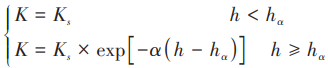 式(1)中,L 为 CB 极限长度(cm),q 为渗透流量 (cm3 /s),Ks为上层土层的饱和导水率(cm/h),φ为层边界面的倾角(o),hα 为上层样品的空气侵入值 (cm),hw为下层的水样本渗透值(cm),α为上层土层的非饱和导水率K用h的指数函数近似时的系数,h 为水头高度(cm)。此外,式(1)中的α为: