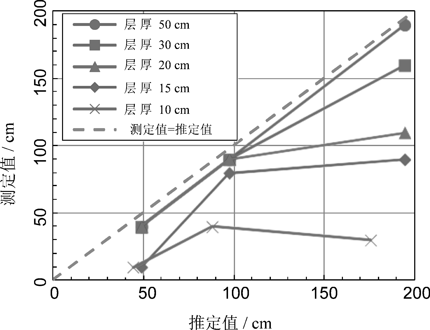 图9 显示了 50 cm、30 cm 和 10 cm 厚度的上层土壤极限长度预测值和测量值的比较结果。50 cm 厚的上层土壤(细砂)的结果,测量值和预测值之间有很好的一致性,这表明此条件是可以应用极限长度估算公式的。厚度为30 cm的上层土壤的试验结果,当极限长度较长时,测量值趋于缩短。厚度为 10 cm 的上层土壤的试验结果,但测量结果有很大差异。在上层土层 30 cm 厚和上层土层 10 cm 厚的情况下,土层厚度小于空气渗透值,应用经典公式时认为土层厚度为 ha。当上层土层 10 cm 厚,层厚极小于空气渗透值,被认为不在极限长度估算公式的适用范围内。然而,在8号硅砂的情况下,当层厚超过30 cm时,可以得到一个稳定的极限长度,并且可以应用极限长度预测公式。
