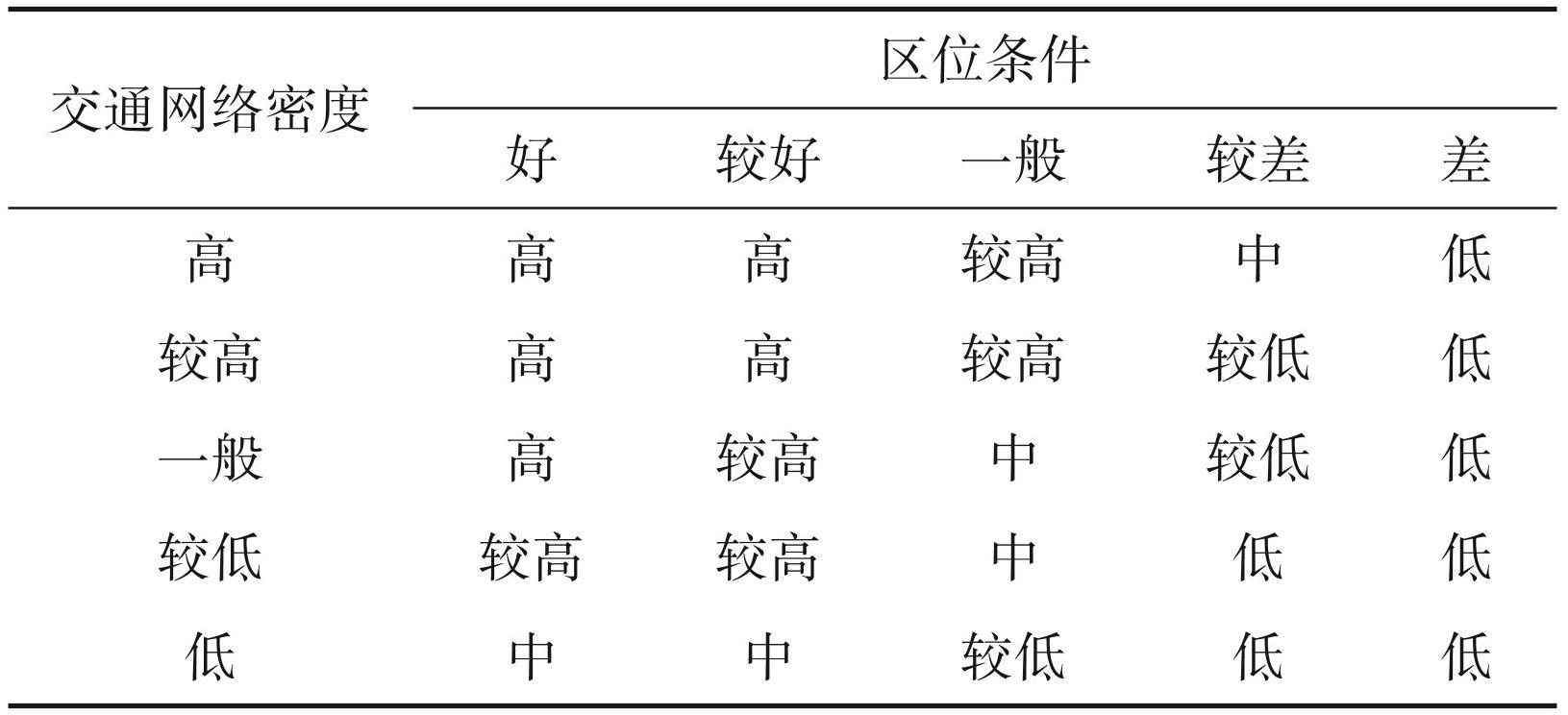在区位条件和交通网络密度评价的基础上开展区位优势度评价。首先,基于中心城区可达性、交通干线可达性、交通枢纽可达性、周边中心城市可达性 4 个指标项的加权求和集成,采用相等间隔法将综合优势度由高到低分为 5、4、3、2、1共 5个等级进行区位条件等级的划分;其次按照交通网络密度由高到低分为 5、4、3、2、1 共 5 个等级,采取自然间断点分级法进行交通网络密度分级;最后结合区位条件和交通网络密度评价结果,进行区位优势度评价,根据判别矩阵(表2),得出太谷县的区位优势度分级图(图4)。