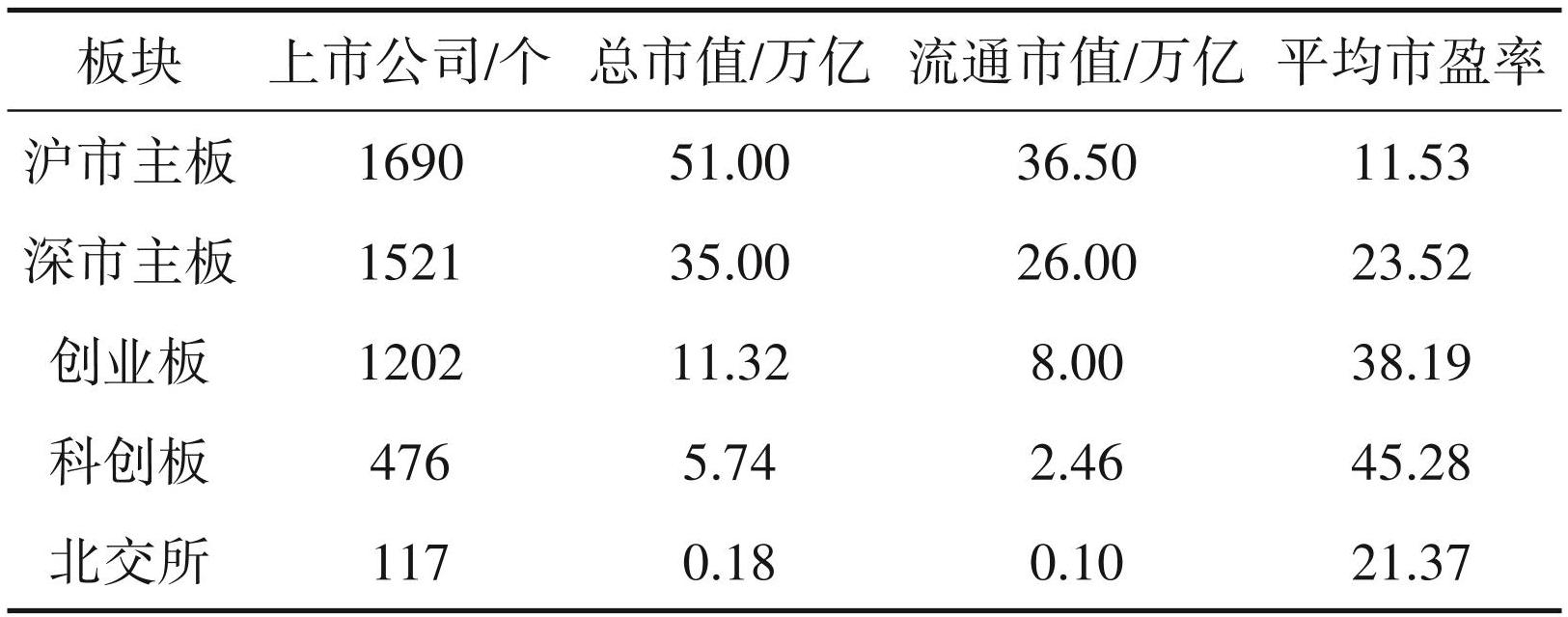 中国股票市场得益于中国经济在过去 30 年里的高速增长,规模迅速成长,截至 2022年底,A股总市值约 80万亿人民币,上市公司数目达到 5079家。形成了主板、创业板、科创板、北交所以及新三板、区域性股权市场在内的多层次资本市场(梁环忠, 2021)。中国多层次资本市场呈现倒三角形态,主板体量及融资规模最大。截至2022年底,沪市主板上市公司 1690家,总市值 51万亿人民币,总流通市值36.5万亿人民币,平均市盈率为11.53;深市主板上市公司 1521家,总市值 35万亿人民币,总流通市值26万亿人民币,平均市盈率为23.52;创业板上市公司1253家,总市值11.32万亿人民币,流通市值8 万亿人民币,平均市盈率为38.19;科创板上市公司 476 家,总市值 5.74 万亿人民币,流通市值 2.46 万亿人民币,平均市盈率 45.28;北交所上市公司 117 家,总市值 1841 亿人民币,流通市值 1074 亿人民币,平均市盈率21.37(表1)。