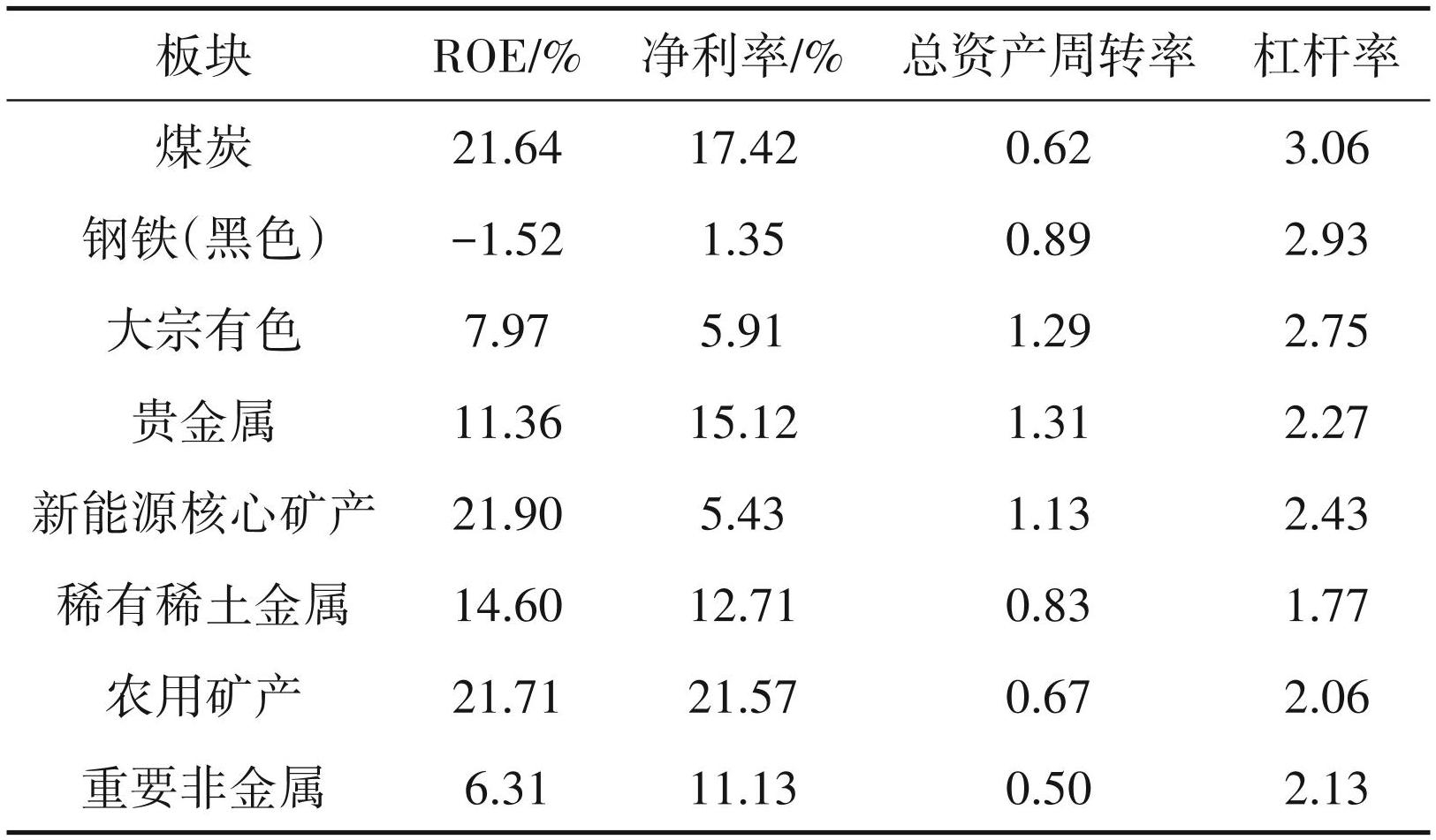 A 股矿业上市公司(除油气)131 家中,煤炭 32 家、钢铁18家、大宗有色20家、新能源14家、贵金属 14 家、稀土稀有 18 家、非金属 7 家,农用矿产 8 家。截至 2023 年 6 月底,平均市盈率 36 倍,平均市净率 2.4 倍,平均净资产收益率 14.2%。各矿业板块体现出不同特点,从盈利能力看,2022 年煤炭、新能源、农用矿产板块最好,净资产收益率均超过 20%。从运营效率看贵金属板块最强,总资产周转率达到 1.31。财务杠杆煤炭板块最高(表3)。