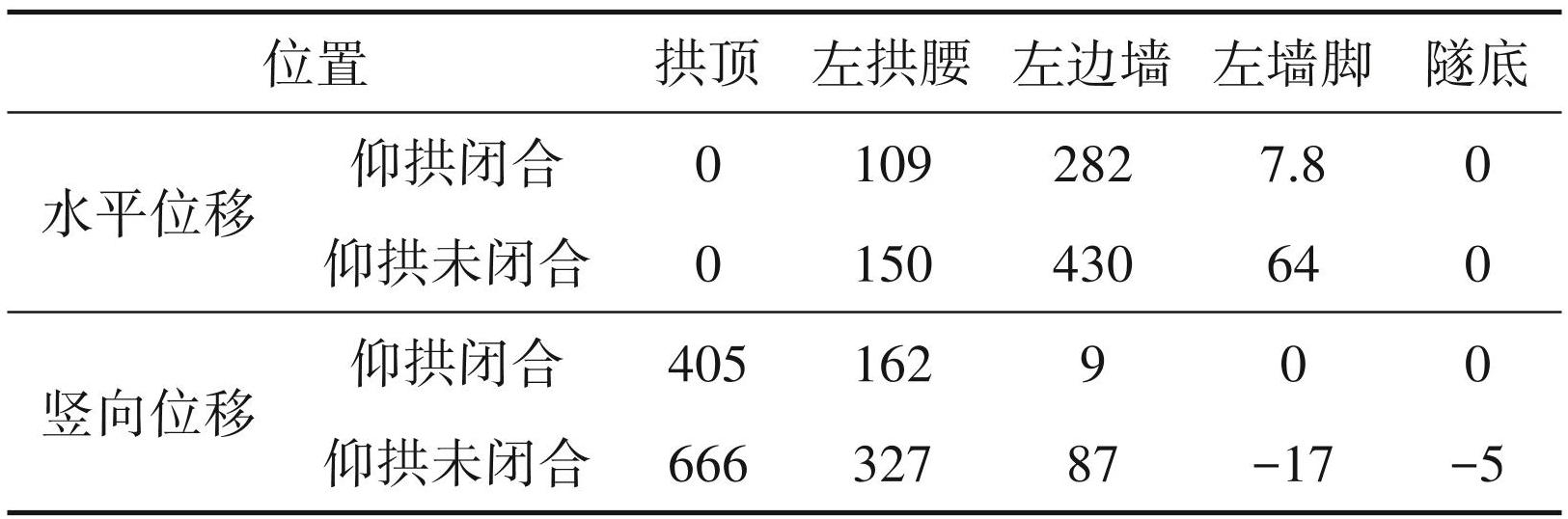 由表6可知,初期支护在仰拱未闭合情况下,隧洞初支每个位置的水平位移与竖向位移值相对较大,而在仰拱闭合后,每个位置的位移值均存在一定幅度的减小,因此,在进行初期支护施工时应尽量使仰拱闭合。