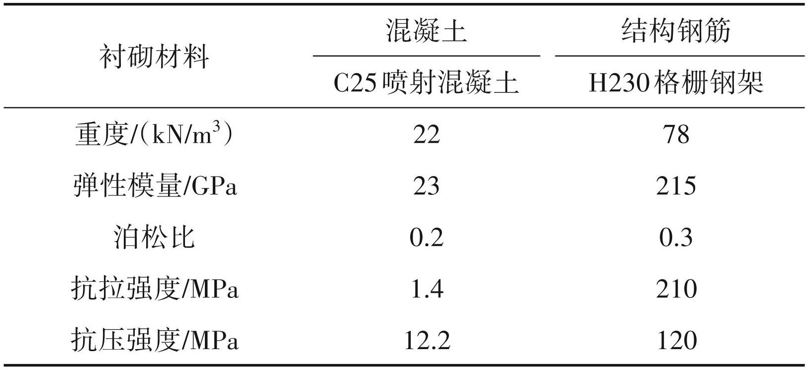 式(1)中,E 为初支后的混凝土弹模(GPa);E0 为原混凝土弹模(GPa);Sg为 H230格栅钢架截面积 (m2);Eg 为钢架弹模(GPa);SC 为混凝土截面积(m2)。