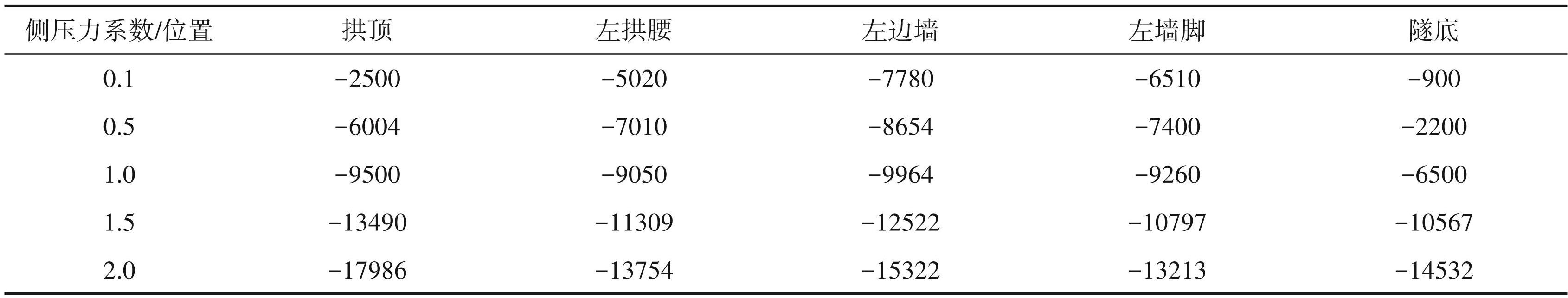 在表2 中,水平位移的负号说明位移向洞外移出,而竖向位移的负号表示竖直向下,当数值越接近于 0,说明位移值越小。另据表2可知,小断面引水隧洞初支的拱顶与隧底的水平位移并未受到侧压力变化的影响,使得两者的水平位移值始终为0。而随着侧压力系数的增大,左拱腰、左墙脚以及左边墙的水平位移出现波动变化,其中,左边墙的水平位移最为严重。在侧压力系数为 0.5~1. 0 时,水平位移向洞内挤入,在 1. 0 时保持最小位移,在 1. 0 以后向洞外挤出,因此当侧压力系数 1. 0 以上发生的水平位移情况更为严重;随着侧压力系数的增加,每个初支位置的竖向位移竖直向上,全部由负数转变为正数,使得竖向位移逐渐升高。初支的每个位置在侧压力系数为 1. 0 时,水平位移值保持最小,而竖向位移会随着侧压力系数的增大逐渐提升。根据上述分析,左边墙的水平位移情况较为严重,而拱顶的竖向位移明显高于其他初支部位,因此,初支状态下左边墙与拱顶的位移情况较为明显,会对施工安全造成一定影响。