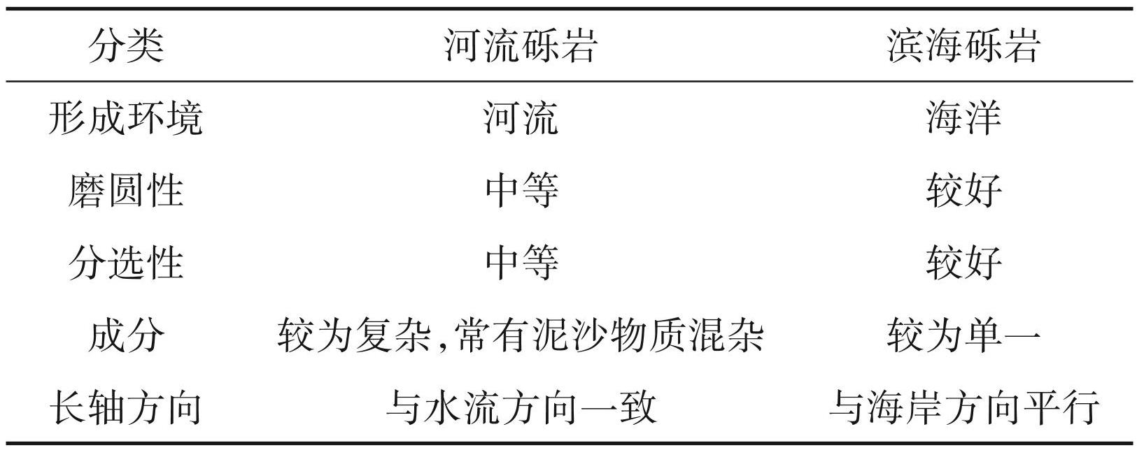 依据砾岩分类:凡直径大于 2 mm 的圆粒状、次圆状砾石含量大于 50%,并经胶结而形成的碎屑岩,称为砾岩。砾石之间的胶结物为砂、粉砂和化学沉积物。砾岩根据成因:可分为滨海砾岩和河流砾岩。在滨海地区形成的滨海砾岩的砾石分选性和磨圆度都比较好,成分也比较单一,砾石的长轴往往平行于海岸的方向;在山区附近,由河流搬运、堆积而成的砾岩叫做河流砾岩,河流砾岩的砾石成分比较复杂,分选和磨圆度较差(表1)。
