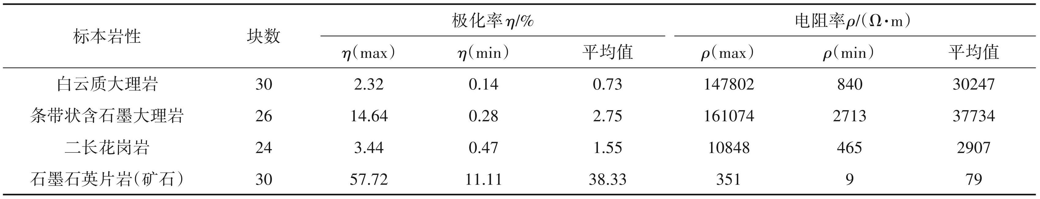 通过对区内的标本进行物性测定,显示矿体与围岩有明显的电性差异,矿(化)体具有“低阻、高极化”的物性特征,与围岩有明显的物性差异。主要标本参数见表2。