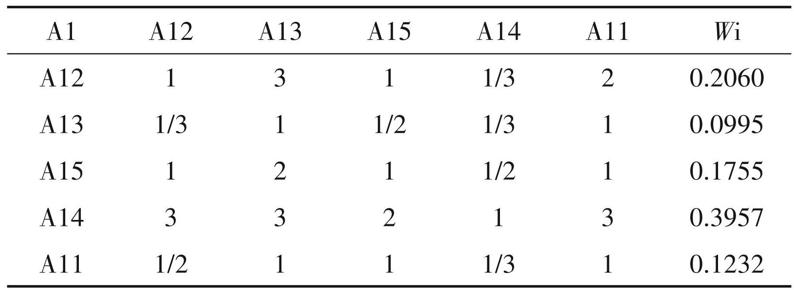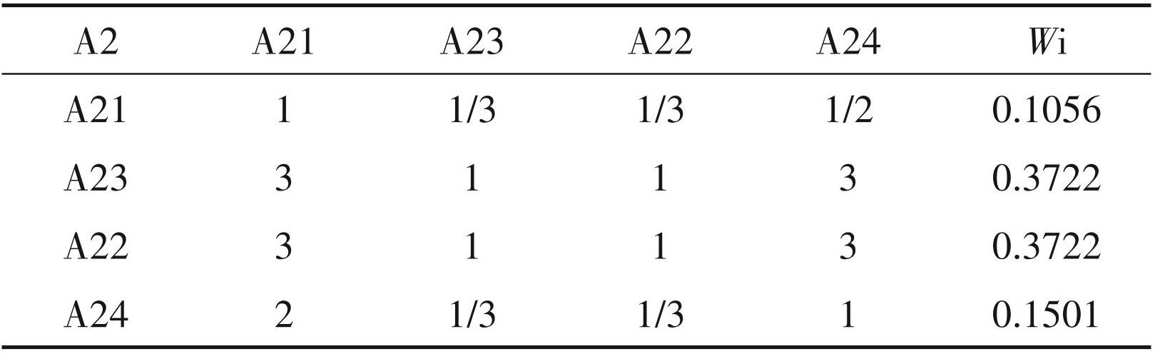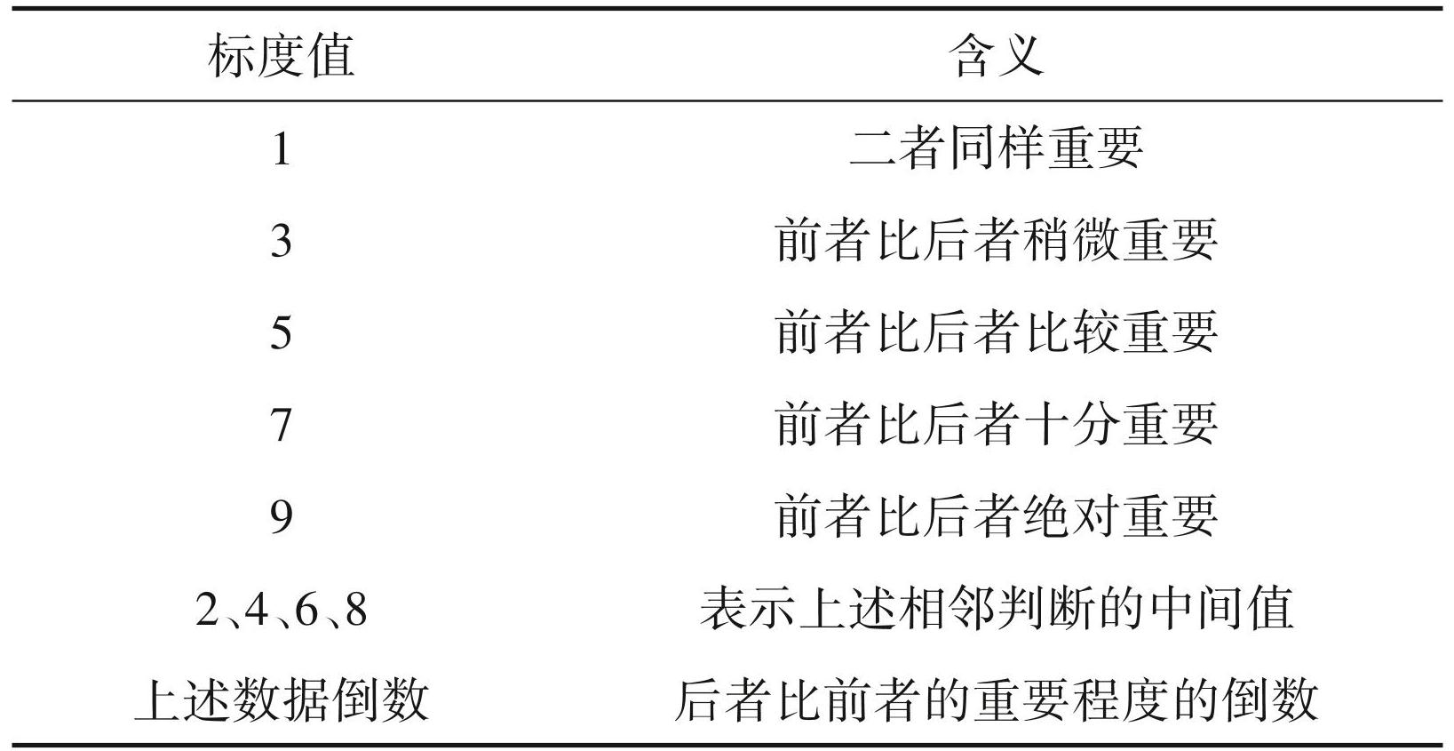 判断矩阵代表本层因素对上一层某一因素的相对重要性,通过对隶属于相同层次的因素采用相同的尺度进行两两对比而构建,成对比较的每层因素不宜超过9个(陈哲锋等,2018,表3)。
