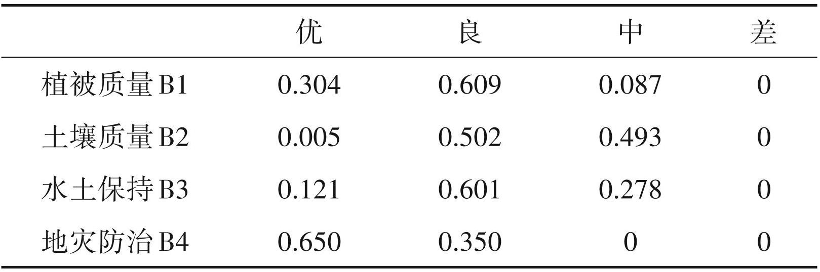 准则层的隶属度矩阵 RB=(R1,R2,R3,R4)T,由该层下属各因素的权重矩阵和隶属度矩阵相乘可得,以植被质量B1为例,其隶属度矩阵R1计算方式如下: