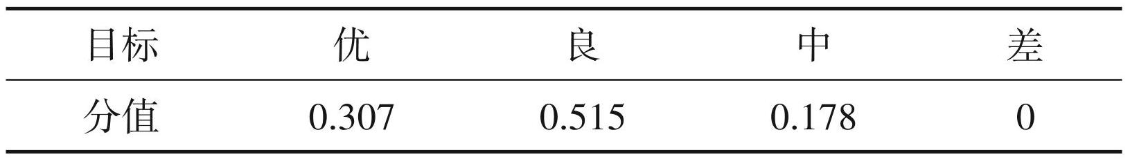在得到各指标层的隶属度后,通过多层次模糊综合评价,进一步得到准则层级与目标层指标层的隶属度,并进行评价。其主要步骤为:(1)确定准则层与指标层的权重矩阵W;(2)将权重矩阵W的指标层或准则层隶属度矩阵 R 相乘,得到上一层级的隶属度矩阵;(3)根据最大隶属度原则,对所得结果进行评价。