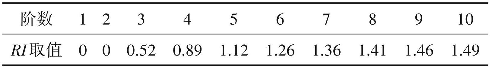 式(5)中,RI为随机一致性常数,其取值和矩阵的阶数有关,具体如表2所示。