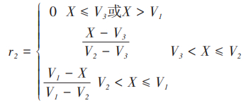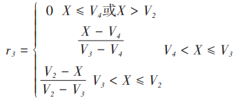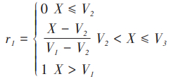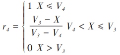 式(6~9)中,X 为实测值,Vj(j=1、2、3、4)为评价标准值,rj(j=1、2、3、4)为隶属度,同一元素隶属度之和应为1。综上,可得指标层隶属度矩阵: