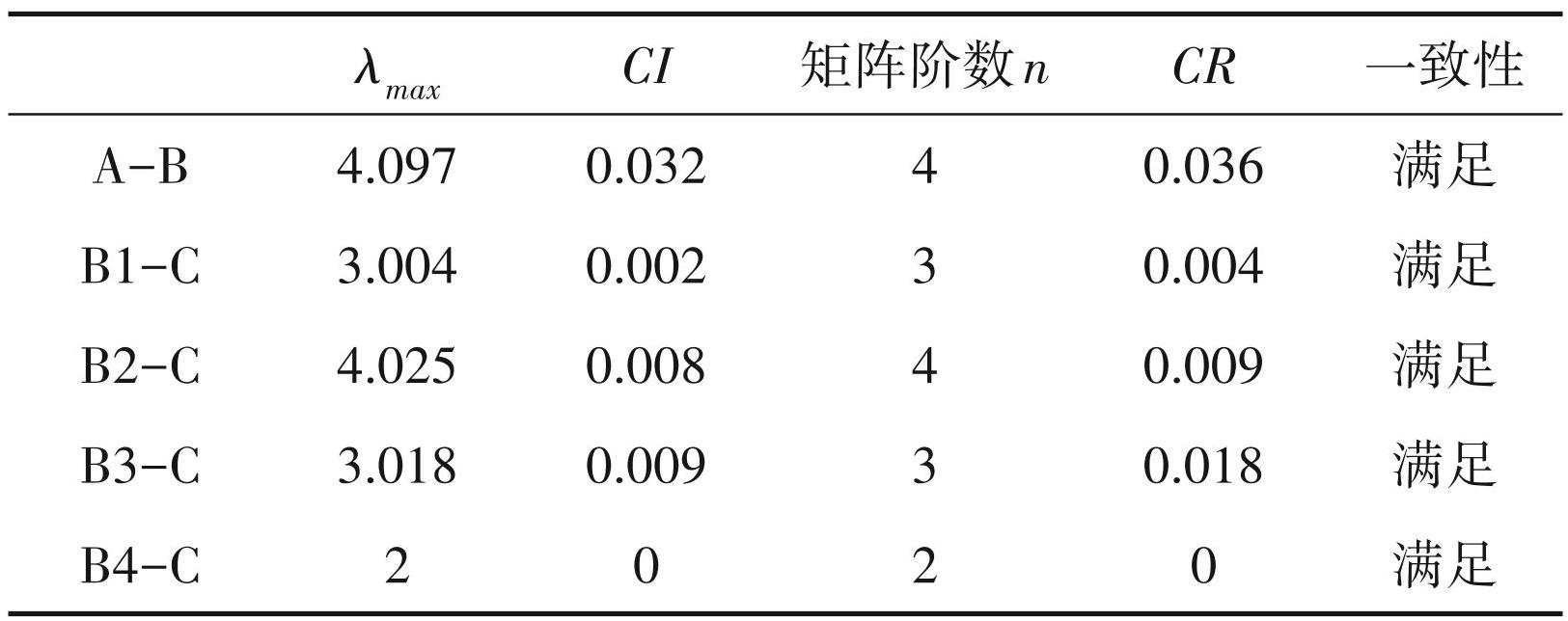 利用公式(3~5),对判断矩阵进行一致性检验,结果如下(表5),可以看到各层级判断矩阵的设置合理,各层次的 CR 均小于 0.1,满足了一致性检验的要求,表明判断矩阵的设置较合理。