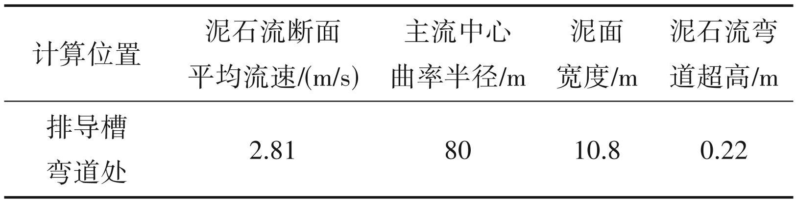 (6)泥石流弯道超高按照《泥石流灾害防治工程设计规范》(DZ/T0239-2004)4.1-4 式进行计算,选择拟布设排导槽弯道附近进行计算,排导槽弯道1处,其余沟道较为顺直。计算结果见表9。