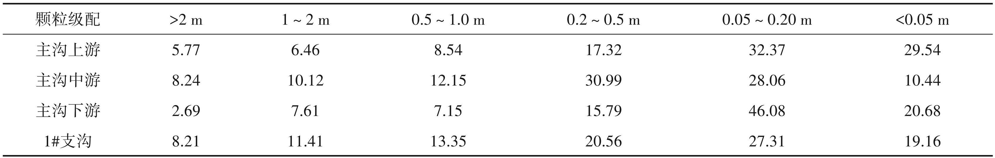 由表2可见,纳休沟泥石流各沟段及支沟内,粒径0. 05~0.50 m所占的比例较大,沟道内块径>2 m 的固体物质所占比例较小。总体来说,沟域物质以碎块石为主,大块石所占比例较小。从空间分布来看,主沟上游、下游及1#支沟以碎块石为主,粗颗粒物源占所比例相对较少,主沟中游 0.2~0.5 m 的块碎石比例相对较高,粗颗粒物源相对较多。