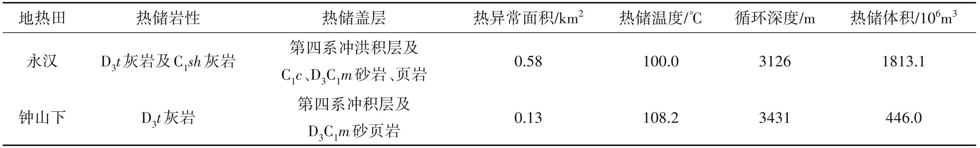 本次研究通过资料收集整理、地热地质调查、地球物理勘查、地热钻探工程及降压试验等方法,圈定了永汉地区地热异常范围并计算了热储温度及循环深度,地热田热储信息见表1。