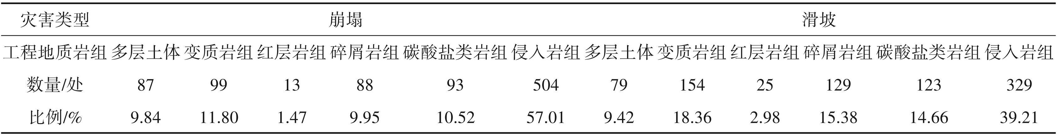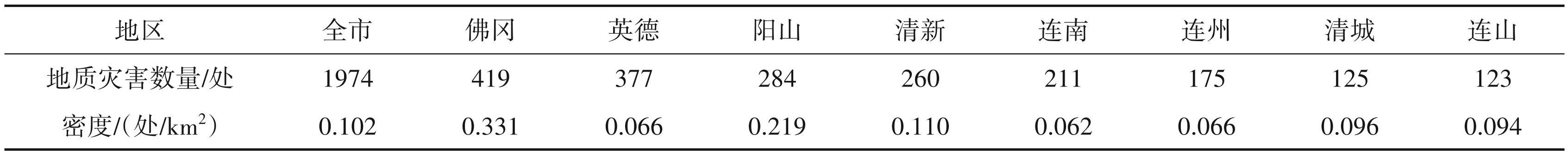 经统计,清远市1978年以来各地区地质灾害土质类型占84.55%,岩质类型占12.67%;地质灾害数量与密度如表1 所示,佛冈地质灾害数量及密度均最高;地质灾害以小型崩塌和滑坡为主(表2);分布地貌、坡度及工程地质岩组类型分别如表3~表5所示。数据表明,清远市地质灾害与地形、地貌、工程岩组的关系显著,崩塌、滑坡广泛分布于丘陵、阶地地貌中,均相对集中于侵入岩组中;其中崩塌主要分布于坡度>60°的斜坡,滑坡主要分布于坡度 30°~50°的斜坡。