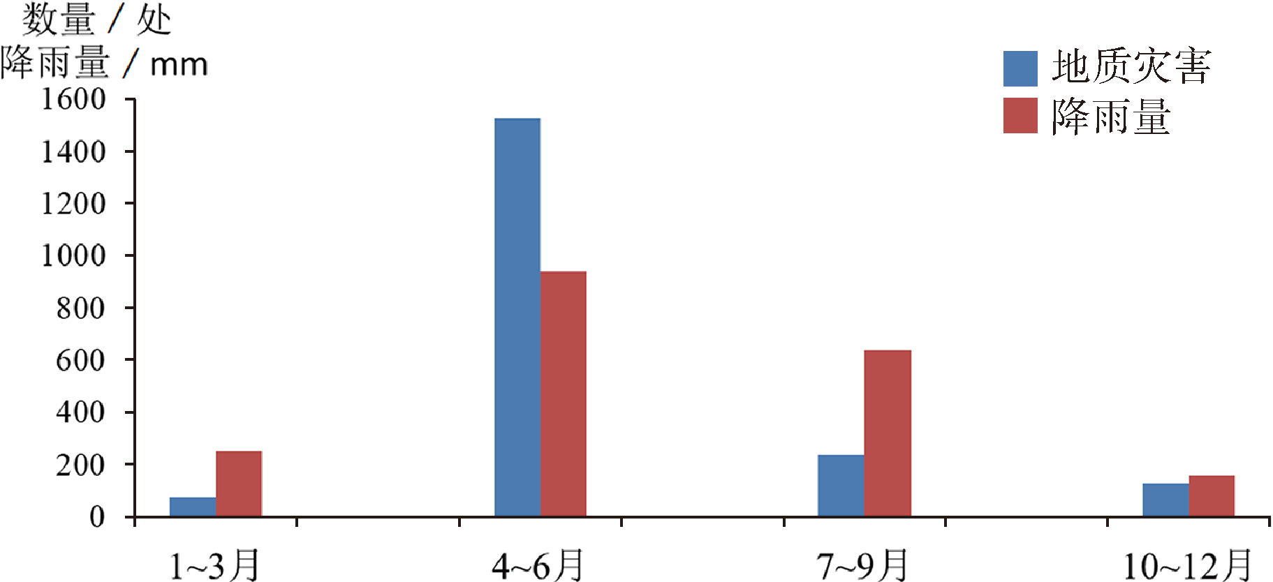 清远市 1978 年以来地质灾害与各时段关系如图2 所示;其中 4—6 月为持续性降雨主汛期,7—9月为台风强降雨集中期,1—3月和10—12月为少雨时期,说明诱发清远地质灾害的降雨类型以持续强降雨为主、其次为台风降雨,最后为局地暴雨。而 1—3月累计降雨量高于10—12月,诱发地质灾害数量却少于后者;说明少雨时期降雨集中的局地暴雨相对分散降雨更易诱发地质灾害。