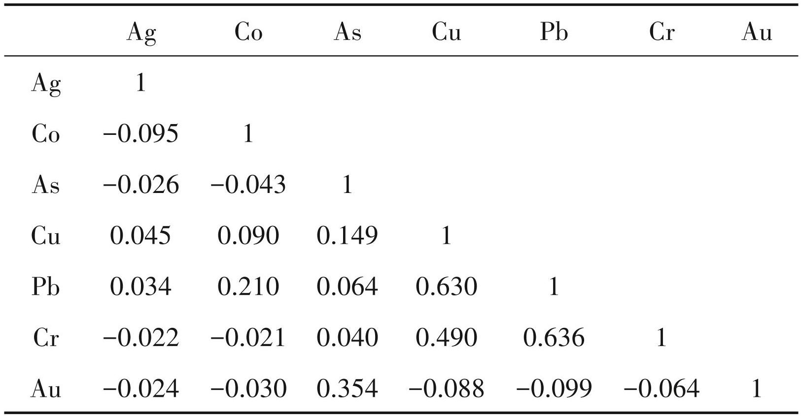 对研究区 Au、Ag、As、Cu、Pb、Co、Cr共 7 种元素进行 R 型聚类分析,R 型聚类分析谱系图见图4,元素相关系数矩阵如表3所示。