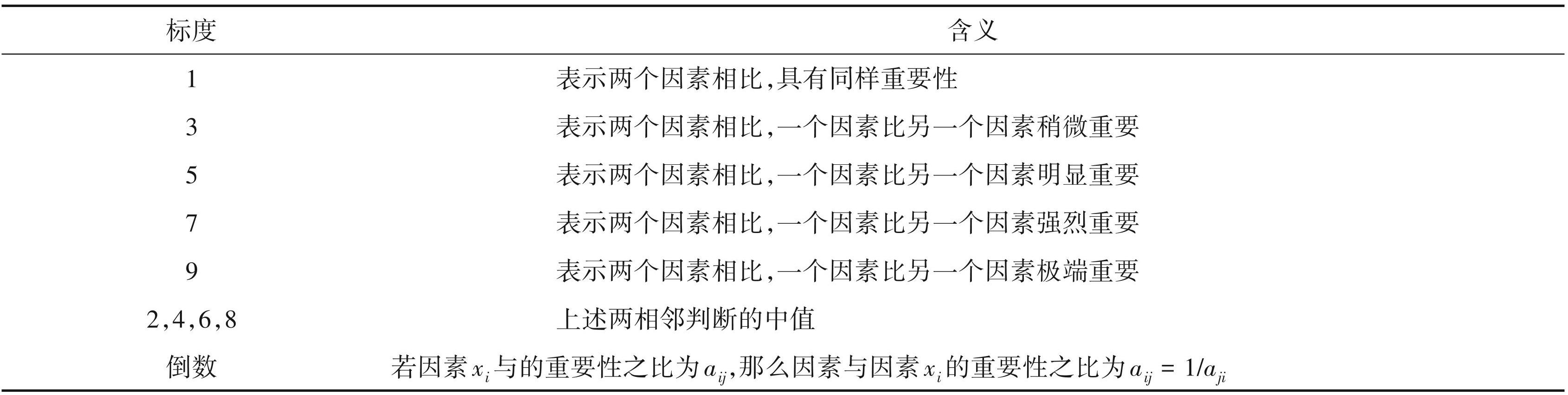 根据各级评价指标体系中的因子对上一层次的重要性进行两两比较,假设有 n 个影响因素需要进行比较:x = {x1,x2,,xn},并以 aij 表示 xi 与 xj 的影响因素之比。通过 T. L. SAATY 创立的 1~9 标度法(表1)对其进行打分,建立一级判断矩阵 A,则一级指标的判断矩阵为: