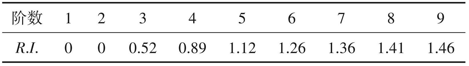 为了度量不同阶判断矩阵的一致性,引入了判断矩阵的平均随机一致性指标 R. I. 值。对于 1~9 阶矩阵,R. I. 值见表2所示: