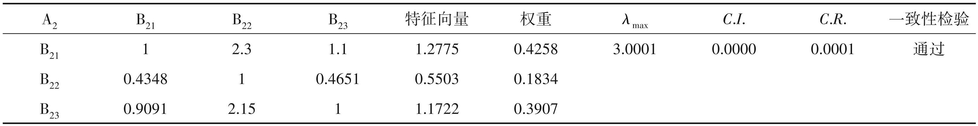 经计算,一级判断矩阵 A 的最大特征根 λmax = 3. 0010。