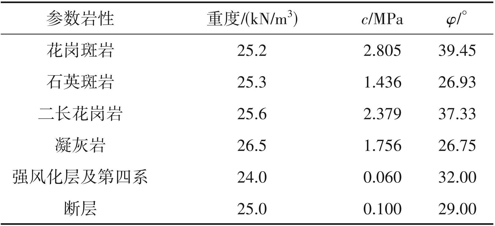 采用 Hoek-Brown 强度准则对不同类型岩石的岩体力学参数进行折减计算,由于边坡各分区高度不同,如果按照各分区单独计算,这样同一岩体将会获得不同的岩体力学参数,而最终对于粘聚力和内摩擦角的确定也缺少相关依据。因此,这里按照最大边坡高度统一进行折减,各地层计算结果见表2。