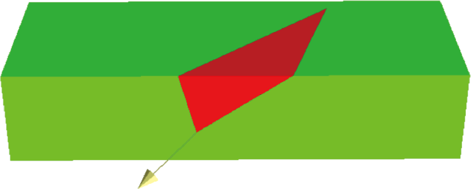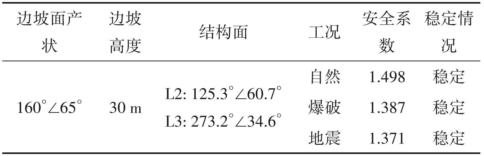 为了分析发生楔形体破坏的可能性,使用 Rocscience公司开发的Swedge软件进行数值模拟分析。根据非煤露天矿边坡工程技术规范(GB 51016-2014)规定,岩体结构面抗剪强度指标易根据现场原位试验确定,当不具备试验条件时,可按照表1取经验值。研究区域结构面属于硬性结构面,岩块岩屑型,结合差。分别计算自然工况(自重+地下水)、爆破工况和地震工况下的边坡稳定性,其中爆破工况与地震工况的水平作用系数按照边坡稳定性分析报告取值。图11所示为楔形体分析计算示意图,绿色表示边坡实体,红色表示由 L2 和 L3 切割形成的楔形体。表2 所示为楔形体计算结果,表明在自然、爆破和地震工况下区域边坡楔形体均处于稳定状态。