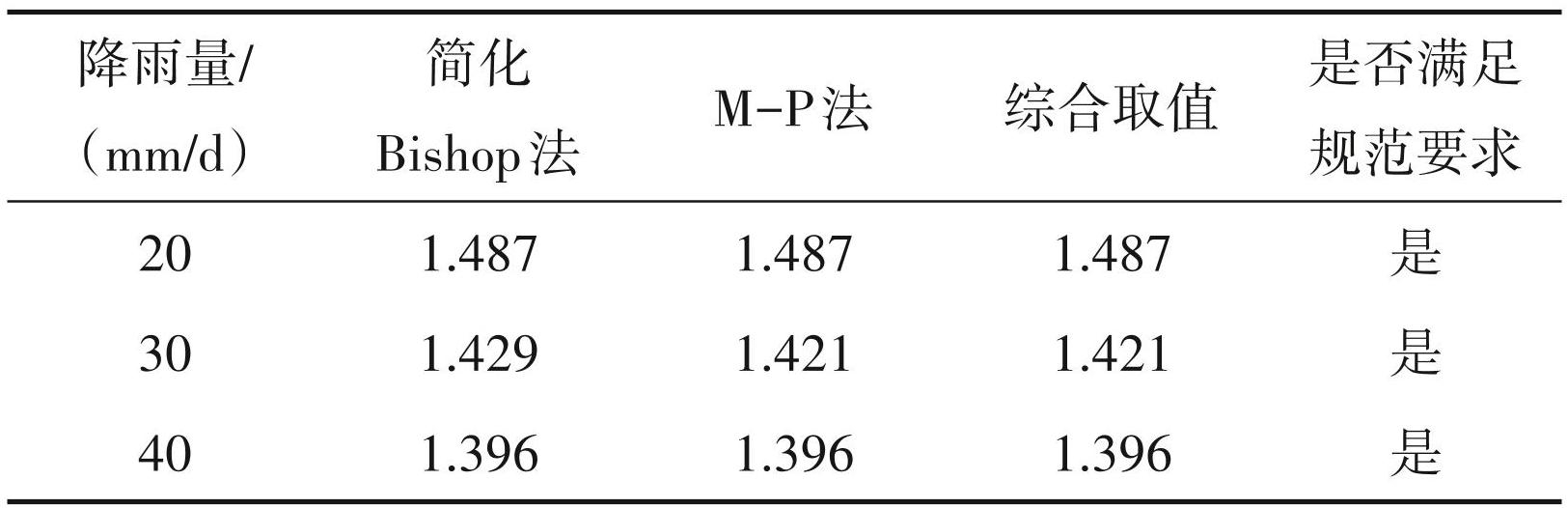 通过分析排土场整体稳定性分析结果可以发现,在降雨量为 20 mm/d 条件下的安全系数为 1.487,大于许用安全系数 1.25,满足规范要求;在降雨量为30 mm/d条件下的安全系数为1.421,大于许用安全系数 1.25,满足规范要求;在降雨量为 40 mm/d 条件下的安全系数为 1.396,大于许用安全系数 1.25,满足规范要求。综合可知,设计排土场边坡在多种降雨工况下整体基本保持稳定状态。
